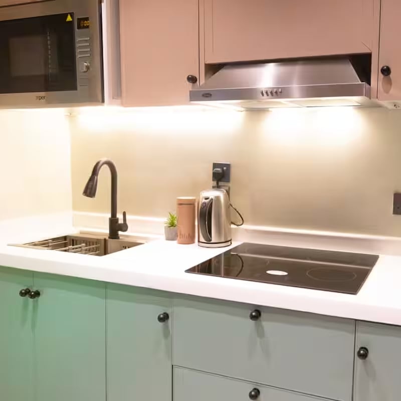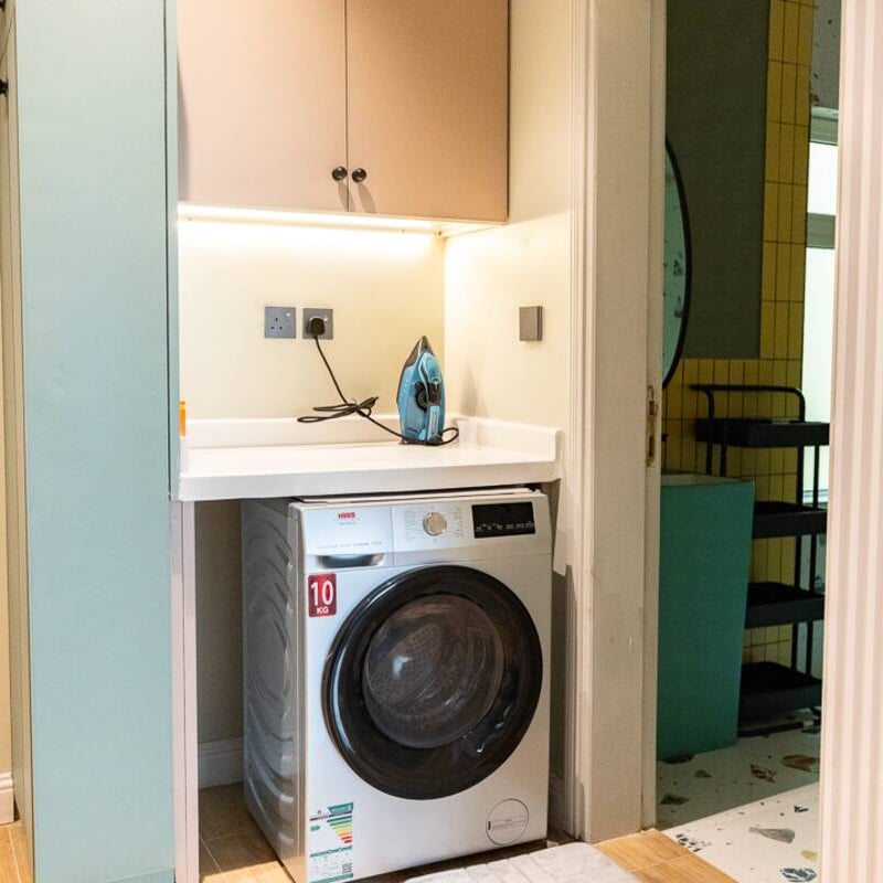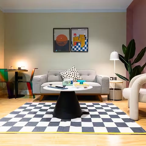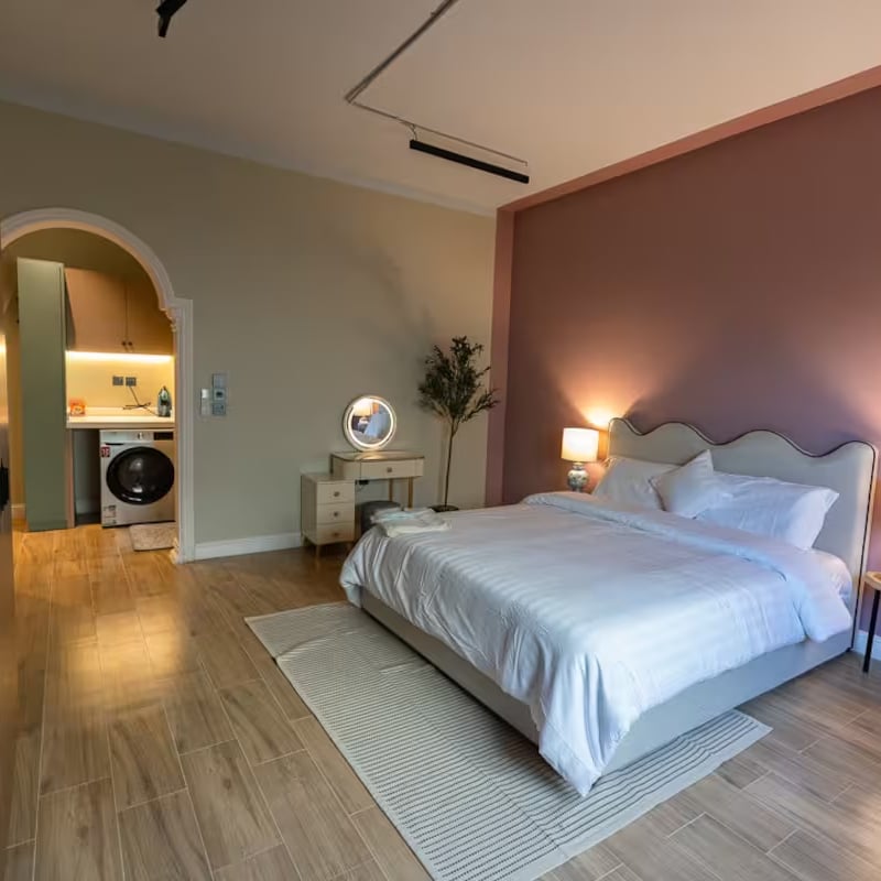 شقة من غرفة نوم واحدة وصالة ومطبخ متكامل تقع في مبنى هادئ للغاية بتصميم داخلي على طراز معرض فني،